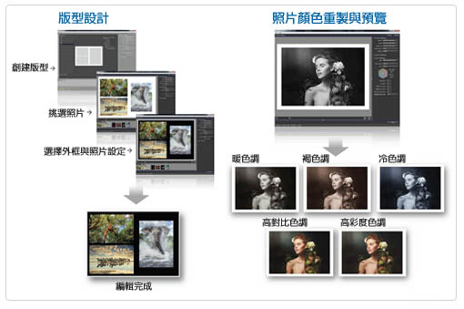 | 使用者可於網站上免費下載Epson Print Layout專業影像編輯軟體,包含版型設計、多張照片拼貼、照片顏色重製、常用紙材設定等強大功能。使用者可以將照片編輯後。調整成自己喜愛的色調,再利用SC-P407印出,利用照片進行居家布置或桌邊擺設,皆能讓您的攝影作品更加出色。 |