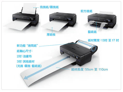 | 支援捲筒紙以及多種紙材輸出,讓SC-P807成為專業平面設計師以及攝影師不可或缺的利器。適用光面相紙、霧面紙、藝術紙、捲筒紙等各式紙材,最大紙材厚度可達1.3mm,可依使用者需求,選擇適合的紙材印製稿件,不會因為紙材長度侷限而只能屈就拼接列印,讓您的創意完整呈現。 |