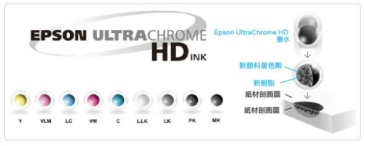全新墨水技術,導入全新UltraChrome HD極致黑墨,高密度成份,讓色階表現更為傑出,在人